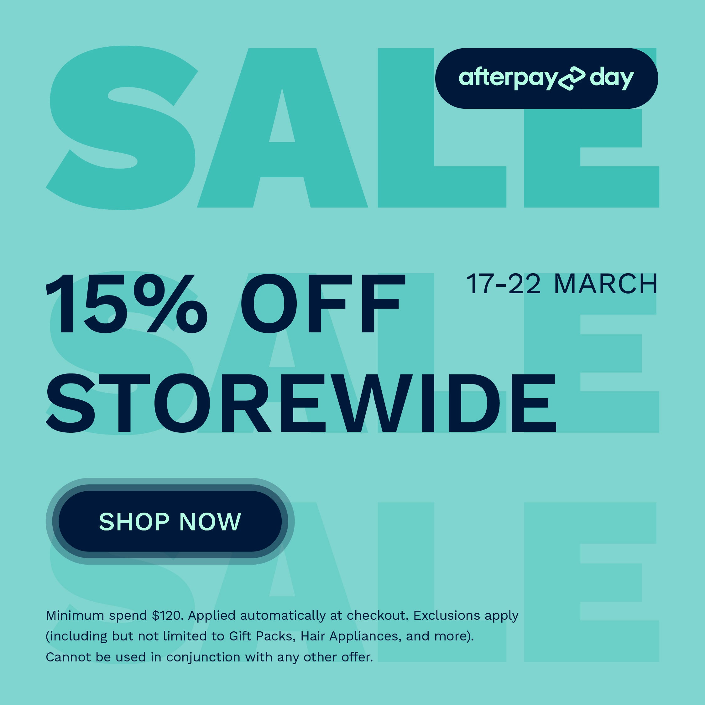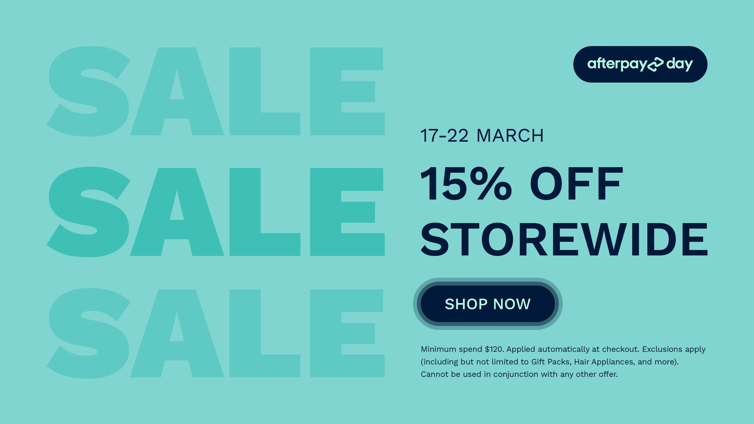 Discount automatically applied at checkout. Minimum spend $120 to receive the promotional discount. Cannot be used in conjunction with any other offer. Exclusions apply (including but not limited to Gift Cards, Hair Appliances and Gift Packs). Promotion begins on Tuesday 17.03.26 and ends Sunday 22.03.26 11:59pm ACDT.