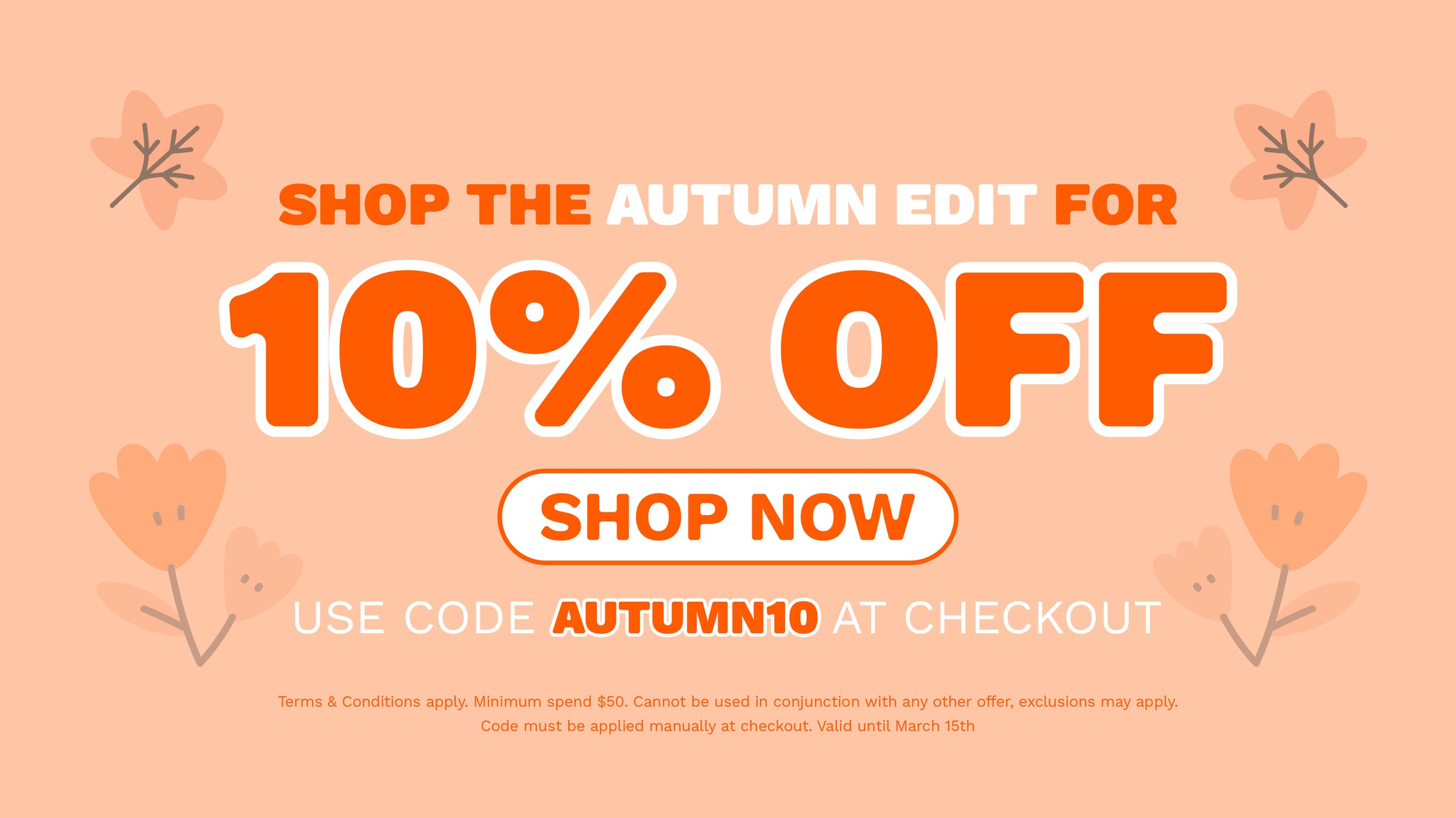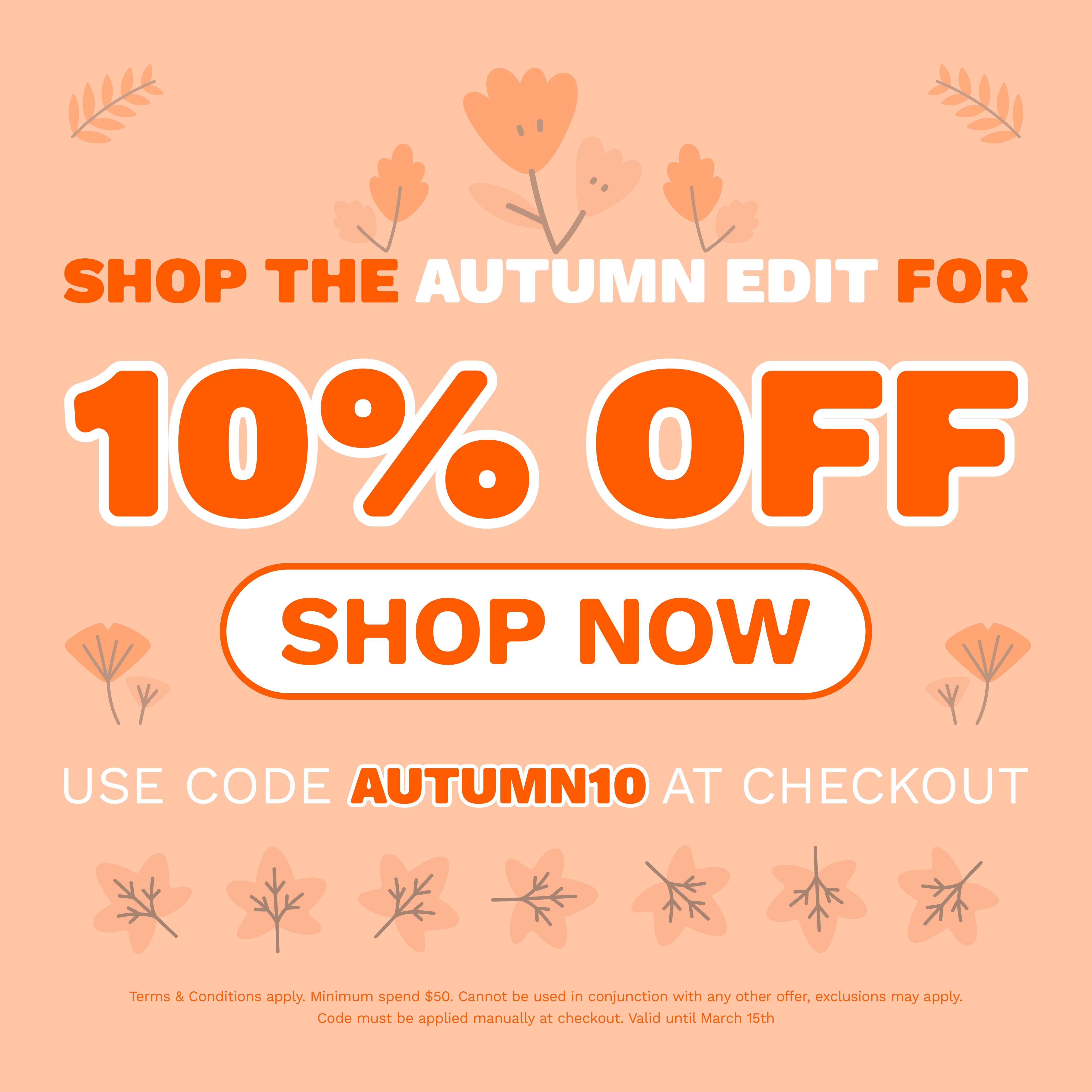 Autumn Promo T's and C's: Discount must be manually applied at checkout. Minimum spend $50 to receive the promotional discount. Cannot be used in conjunction with any other offer. Exclusions may apply. Promotion 15.03.26 at 11:59pm ACDT.