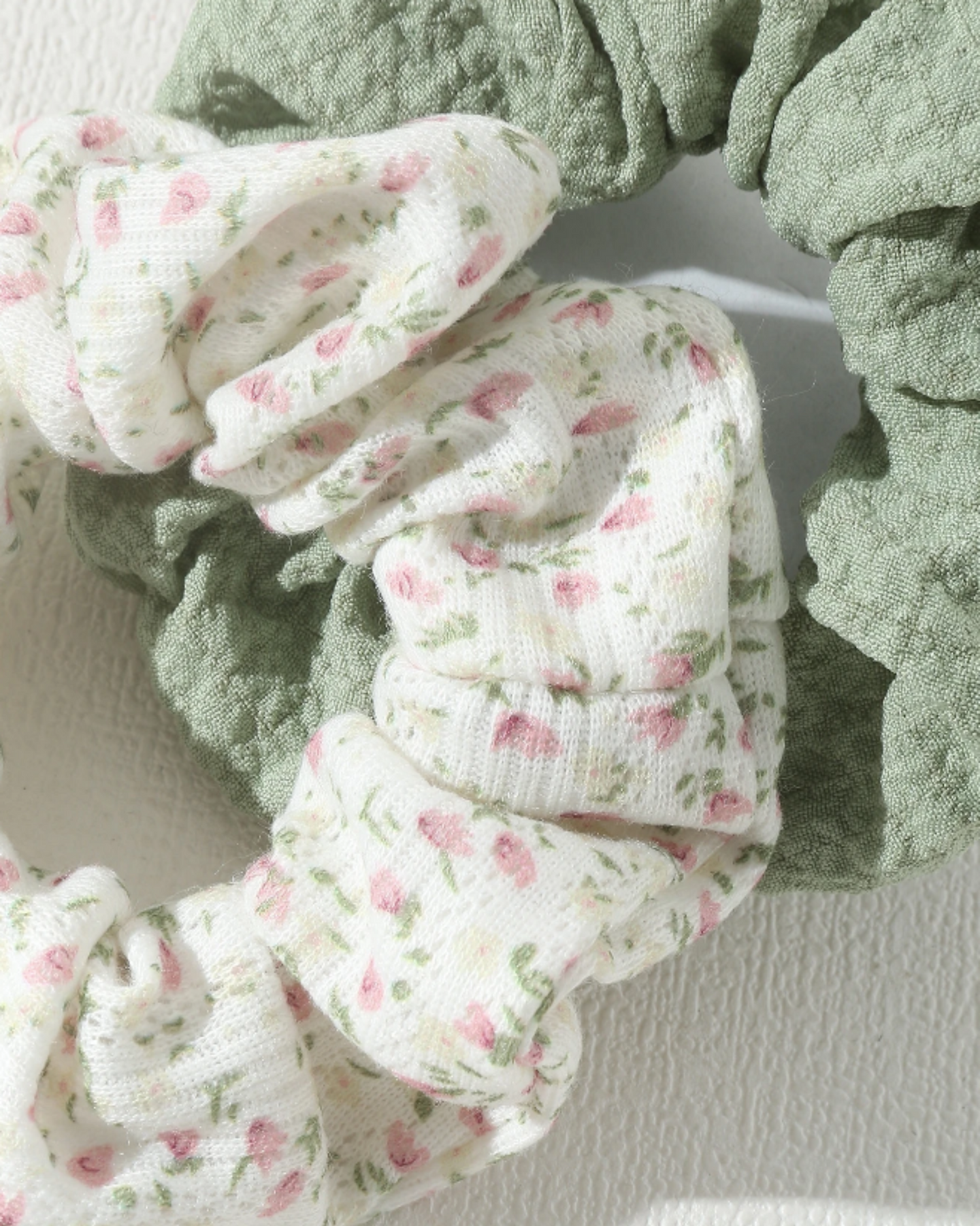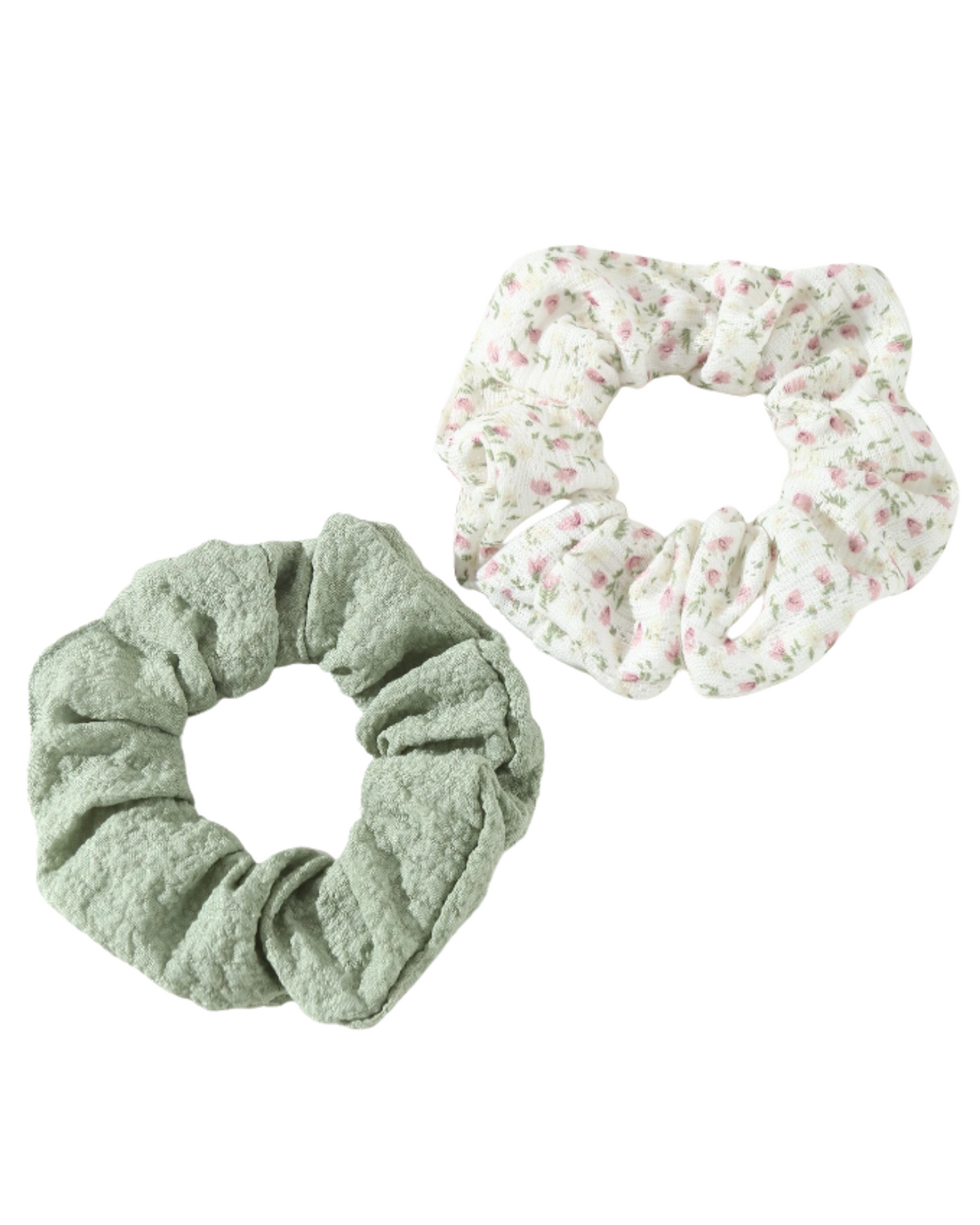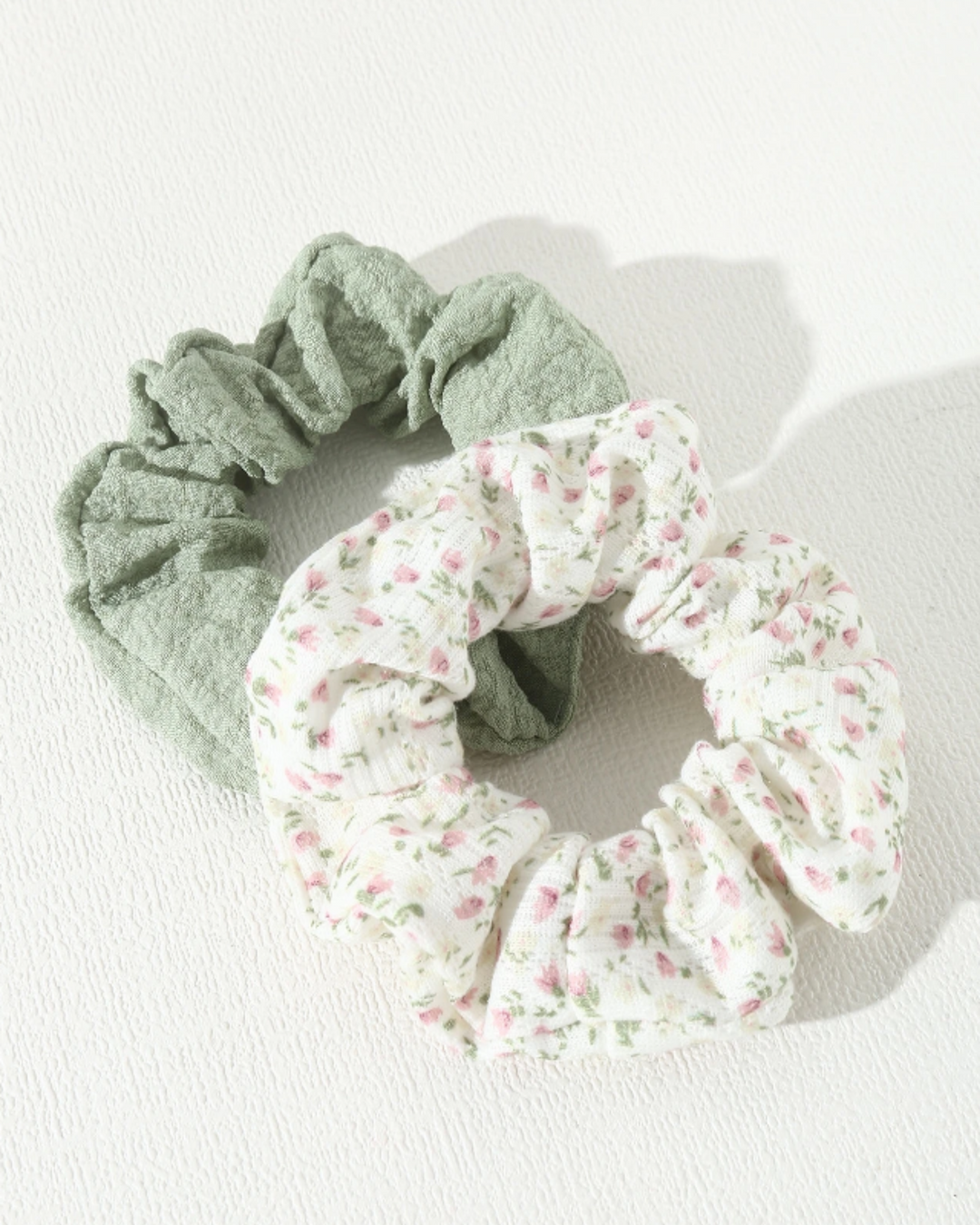 The Bloom Set includes a soft pale olive scrunchie and a floral print scrunchie — the perfect pair for throwing your hair up with zero effort but all the vibe. Wear them solo or stack them together for a fresh, feminine finish.